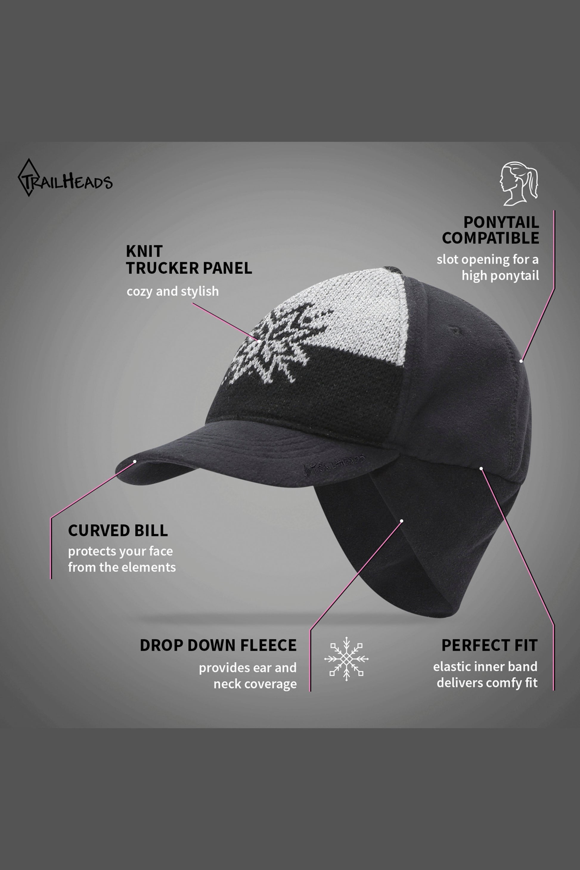 Our Women’s Snowflake Trucker Hat offers incredible performance and style. The trucker hat front panel is made from a cozy knit that provides an extra layer of warmth and protection. It features a cute black and grey snowflake design that will enhance your winter wardrobe.