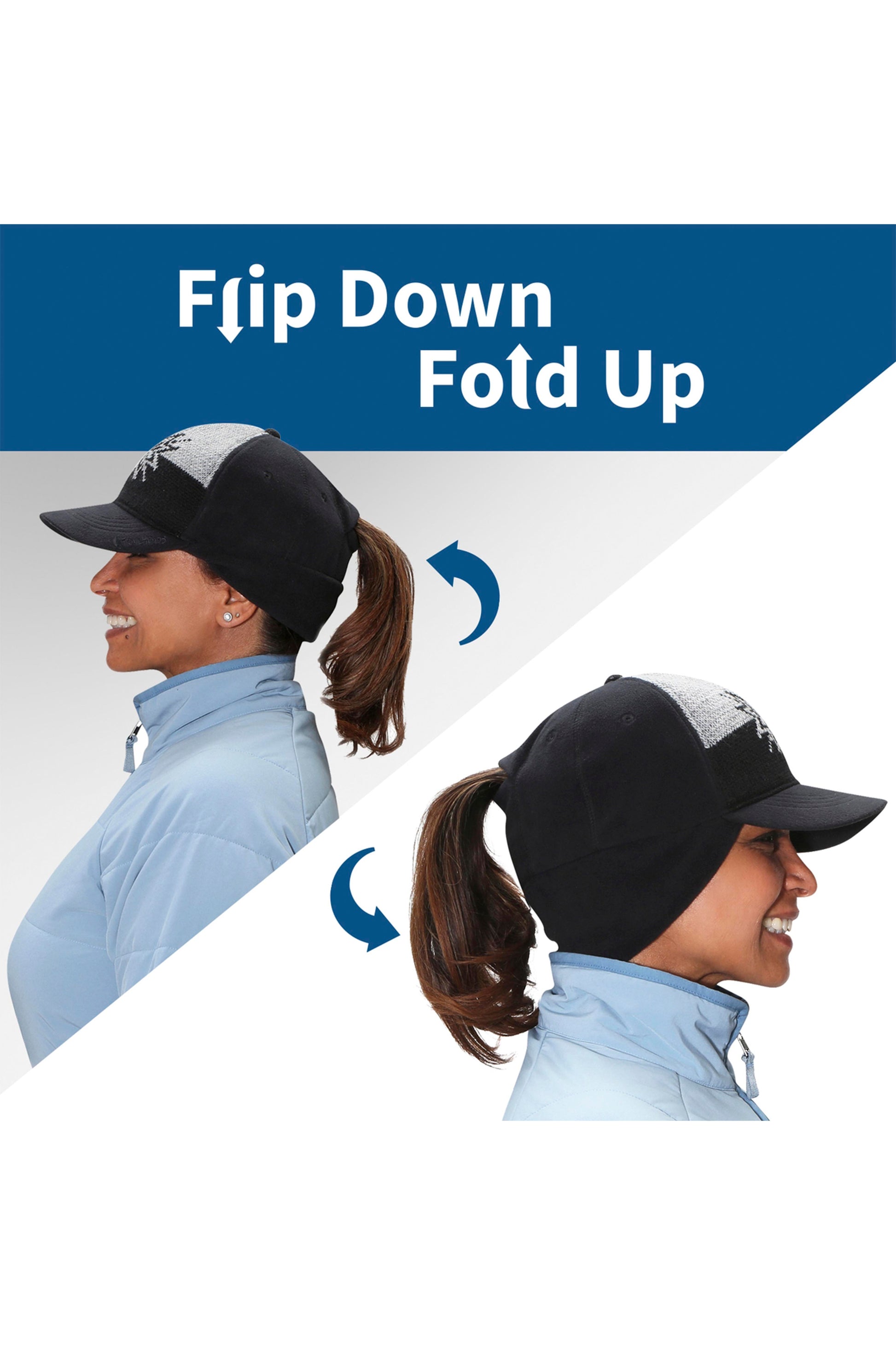 This is one of our winter hats for women that features a drop down fleece ear warmer. Cold when you step outside? Flip the fleece down to provide protection for your ears and neck. Once you warm up you can fold the fleece back up. The fleece is moisture wicking and quick drying to keep you comfortable as you run or hike.